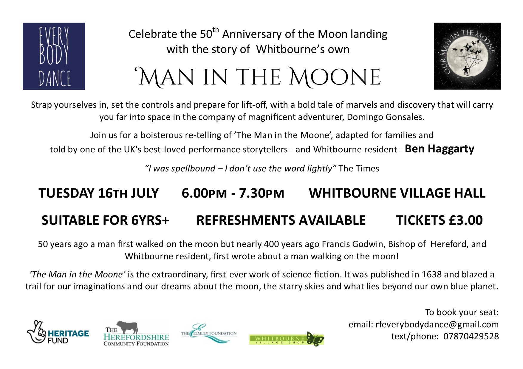 On the 50th anniversary of the first landing on the moon, join us for the retelling of The Man in the Moone, the first – and most extraordinary – work of science fiction created, published in 1638 and written by Bishop Francis Godwin whilst living in Whitbourne village.